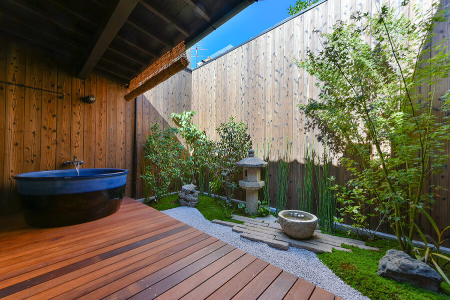 Air conditioning and floor heating makes this Machiya an ideal stay all year round. Equipped with modern conveniences, the stay is just a two minute walk to Kitano Tenmangu Shrine and after a day out exploring the local neighborhood you can relax in the outdoor bath made of Shigaraki ceramic.