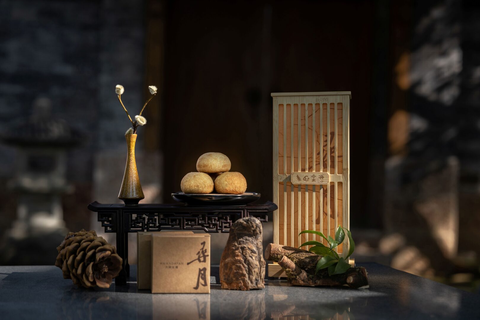 Overlooking the Old Town of Lijiang, Amandayan’s seasonal confectionary collection celebrates the convergence of Naxi culture and snow mountain spirituality. The gifts are contained within a lamp-shaped holder, crafted from highland bamboo with carved vertical patterns inspired by the ancient Tea Horse Road. Traditional Dongba pictographs appear alongside Chinese characters, creating a meaningful cultural dialogue.