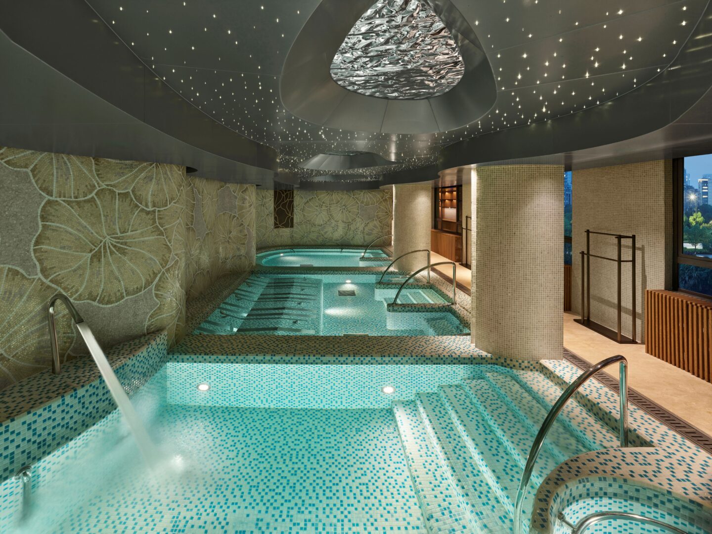 The hotel offers 100 rooms and suites, including 20 family-friendly layouts in a dedicated parent–child building. At its heart is a hot spring complex fed by two mineral-rich wells, featuring 26 indoor and outdoor pools — from grotto springs to petal pools — set among stone forests, bamboo groves, and mist-covered hills.