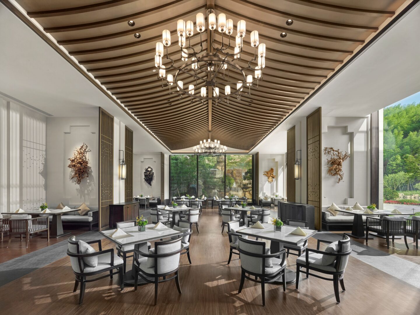 Dining follows the seasons, with Nan Xiang Restaurant showcasing fresh local produce in Zhejiang-inspired dishes, Shanyin Bar serving coffee, handmade teas, and light desserts, and Star Bar offering cocktails and craft beers in a relaxed setting.