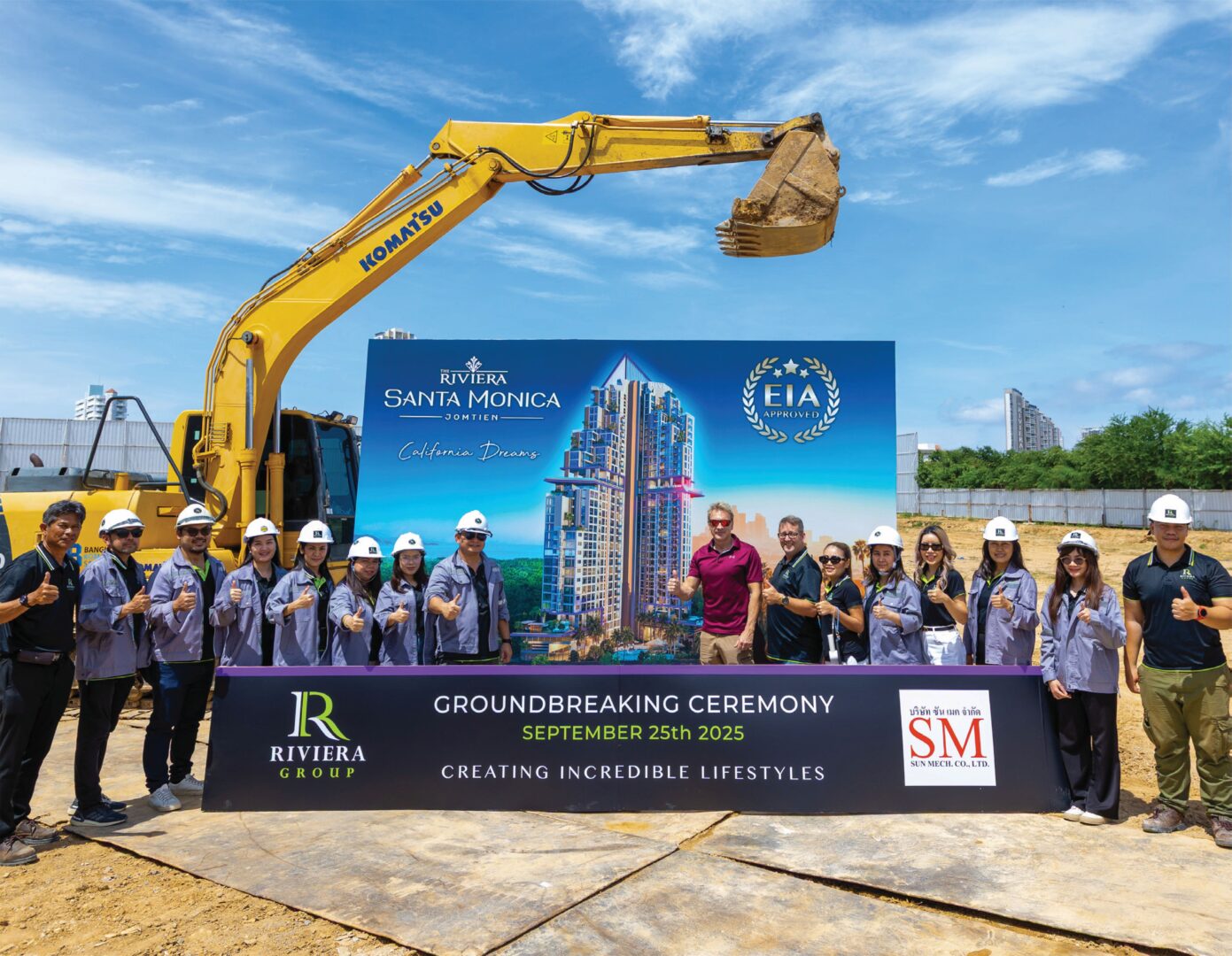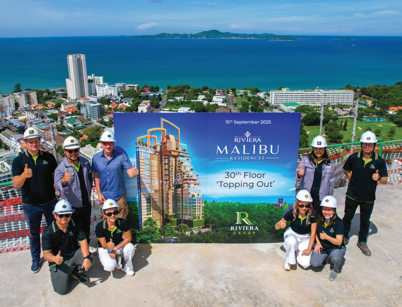 Also making news is their almost sold-out project in Pratumnak, The Riviera Malibu. The project that started the LA concept projects the company has started to deliver to the market since 2024. The Roof top was finally poured and completed with a small celebratory gathering of Senior Team members as seen below. The project due to finish late next year comprises of 274 units only and also like their Santa Monica project is loaded with facilities and unusual recreational features such as a double bowling alley. Already commanding a dominating position on the Pratumnak skyline, today, there are only 2 units left, one being a stunning Duplex for that lucky buyer.