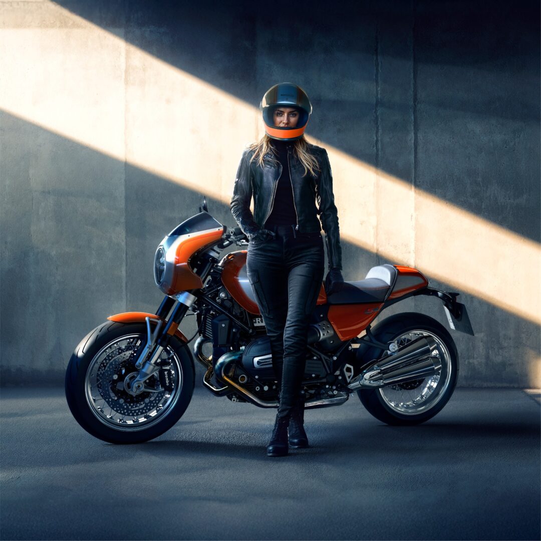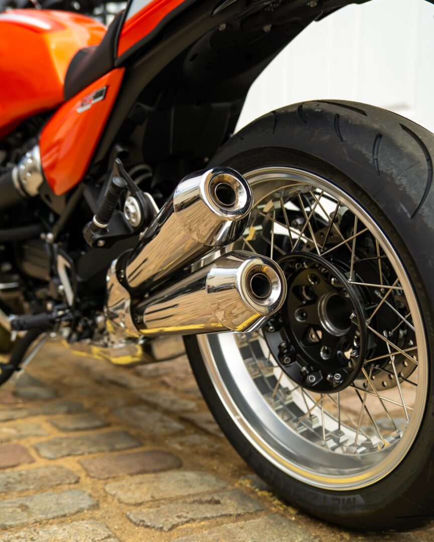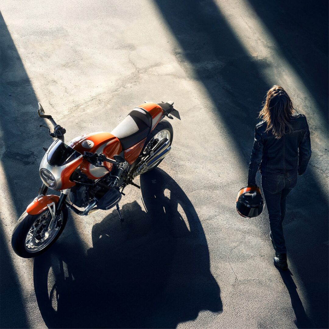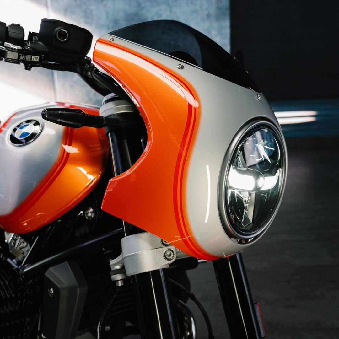 One of the most iconic features of the original R 90 S was its handlebar-mounted headlamp fairing with a tinted windscreen – elements that now return in the design of the BMW R 12 S. Further nods to the original include the contrast-stitched seat, and the striking Lavaorange metallic paintwork, inspired by the legendary Daytona Orange from the 1975 R 90 S. Additional sporty-retro details include the red “S” emblem on the side panel, twin red pinstripes across the bodywork, and brushed aluminum surfaces on the fuel tank and seat area with clear coating for a polished yet vintage look.
