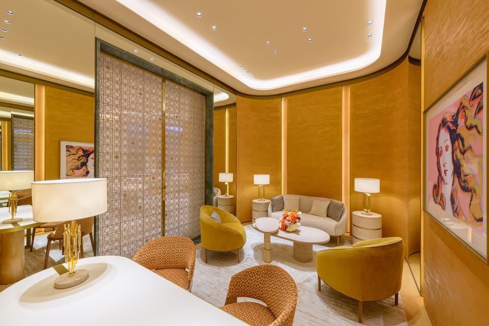 The welcoming ambience is created through combining colours, materials, different textures and shapes, as well as soft elements to add warmth to the space. The wall finishes throughout the interior are a combination of a fluted, waved textured pattern, and precious silks further enriched by golden brass inserts.