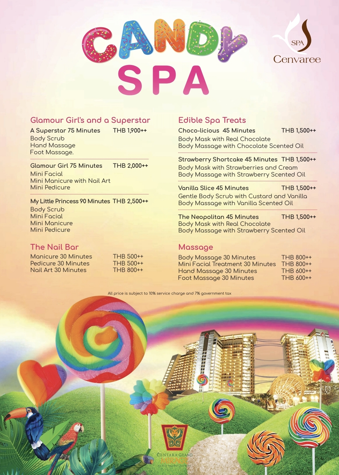 The first Candy Spa, operated by SPA Cenvaree, has been open since 2021 at the Centara Mirage Beach Resort in Dubai. Centara Grand Mirage Beach Resort Pattaya is Thailand’s first Candy Spa.