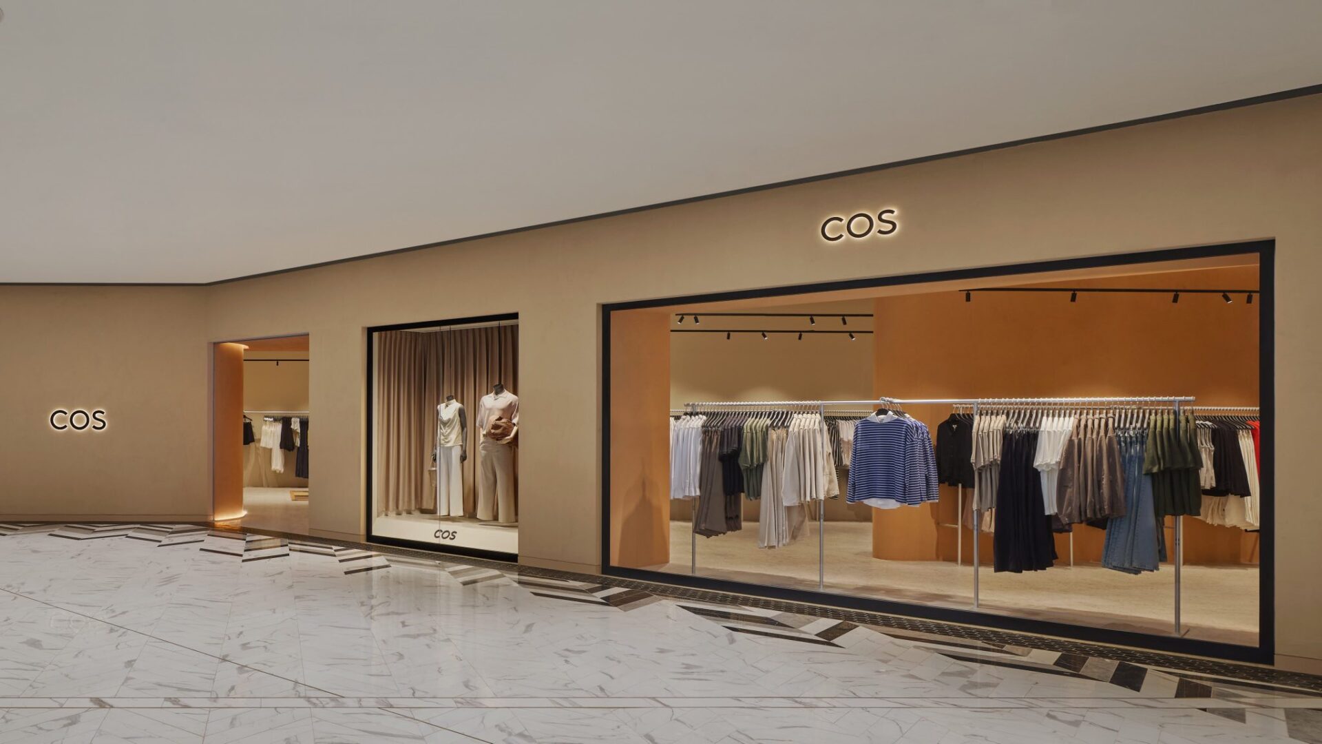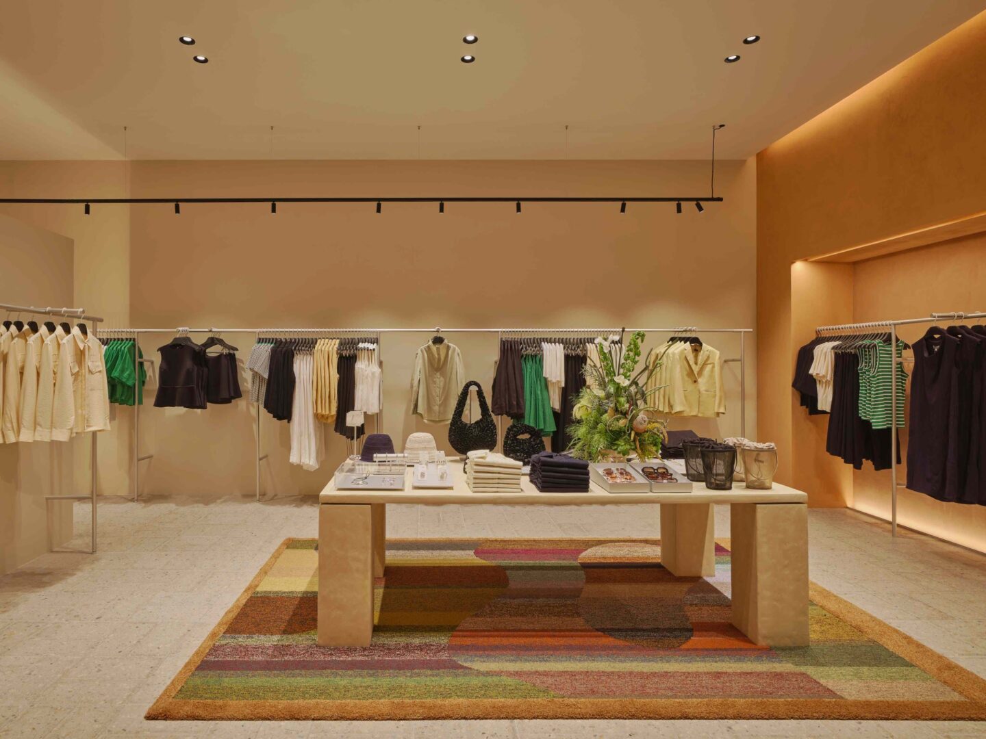 Designed by experts in interior and sustainability, COS’s first store outside Bangkok occupies 340 sq.m. with a natural, neutral aesthetic. The walls use locally sourced clay, bamboo showcases, and 100% recycled Smile Plastics. The terrazzo flooring contains over 90% recycled materials, and the Kasthall carpet is made from surplus yarn. Vintage and modern furnishings—like Giancarlo Piretti’s Alky chair, a Six the Residence table, and a NOR11 daybed—enhance the space. Bon Bon lights by Helle Mardahl add playful warmth.