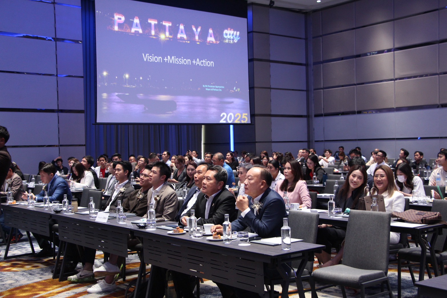 Mr. Poramet Ngampichet, Mayor of Pattaya, shared that Pattaya benefits from a prime location, which the city has leveraged to fulfill its vision of becoming “A City for Everyone” and a world-class destination. Last year, over 24 million tourists visited Chonburi, with 80-90% of them heading to Pattaya. He also emphasized the city’s use of digital data systems to address issues such as flooding at 22 critical points, reducing them to just 9, and combating encroachments on public areas for development. Additionally, the long-awaited construction of the National Sports Center for the Eastern Region, with a capacity of 20,000 seats, is set to be completed during this administration.