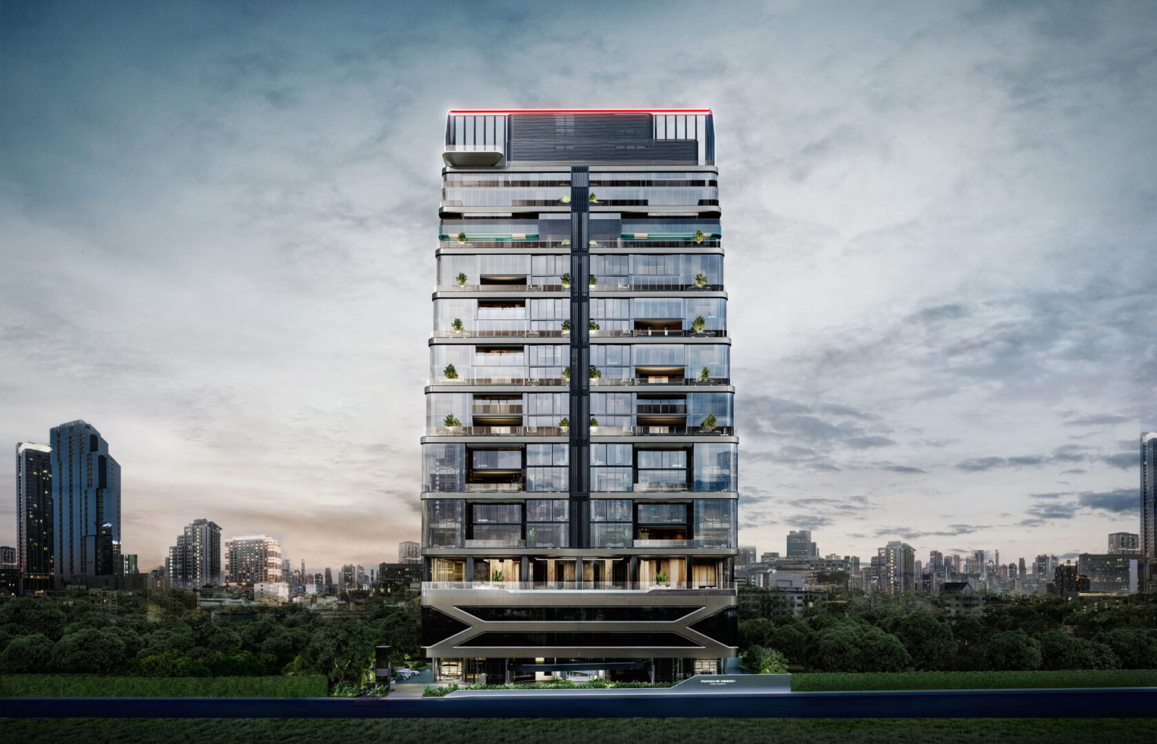 The Crown – A striking rooftop architectural element inspired by Porsche sports car lighting design, poised to become a new skyline landmark.