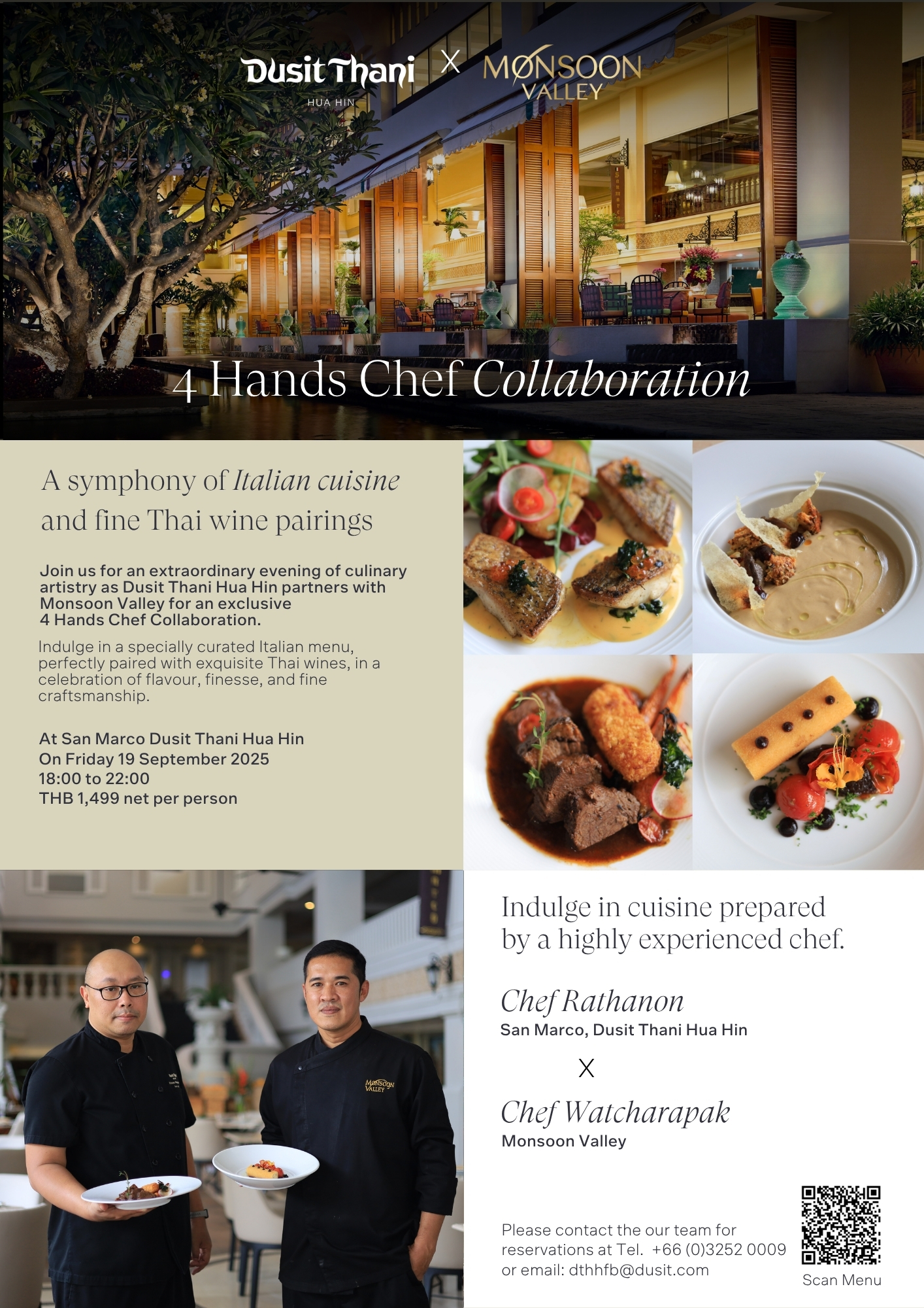 Dusit Thani Hua Hin proudly announces an exclusive gastronomic event, An Evening Where Flavour Meets Artistry, to be held at San Marco Italian Restaurant on Friday, 19 September 2025, from 18:00 – 22:00 hrs.