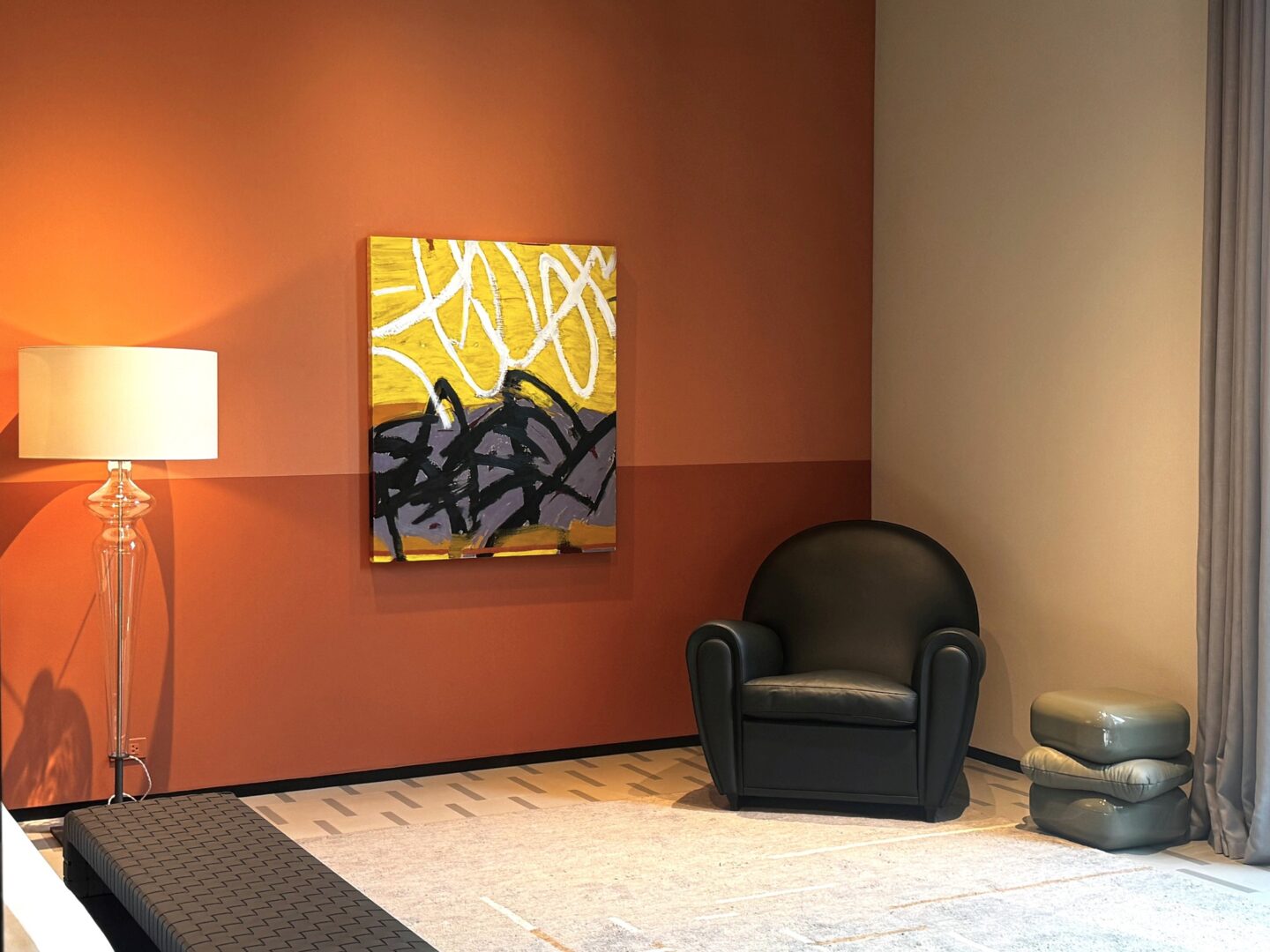 The Poltrona Frau zone features works by abstract artist Orginjonathan Orginakij, who expresses social perspectives through his art while also serving as a lecturer at Rajabhat Rajanagarindra University in Chachoengsao.