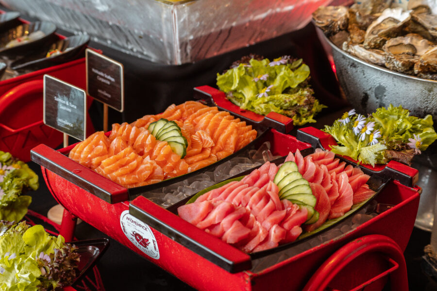 Australian Wagyu Beef Flank Steak, Imported Fine De Claire Oysters No.3, Wide Selection of Cold Cuts & Cheeses, Seafood on Ice (Rock Lobster, Tiger Prawns), Unlimited Egg Benedict Selection, Live Cooking (Salmon Tartare), Sushi & Sashimi (Salmon, Tuna, Octopus) Largest Dessert Selection in Town