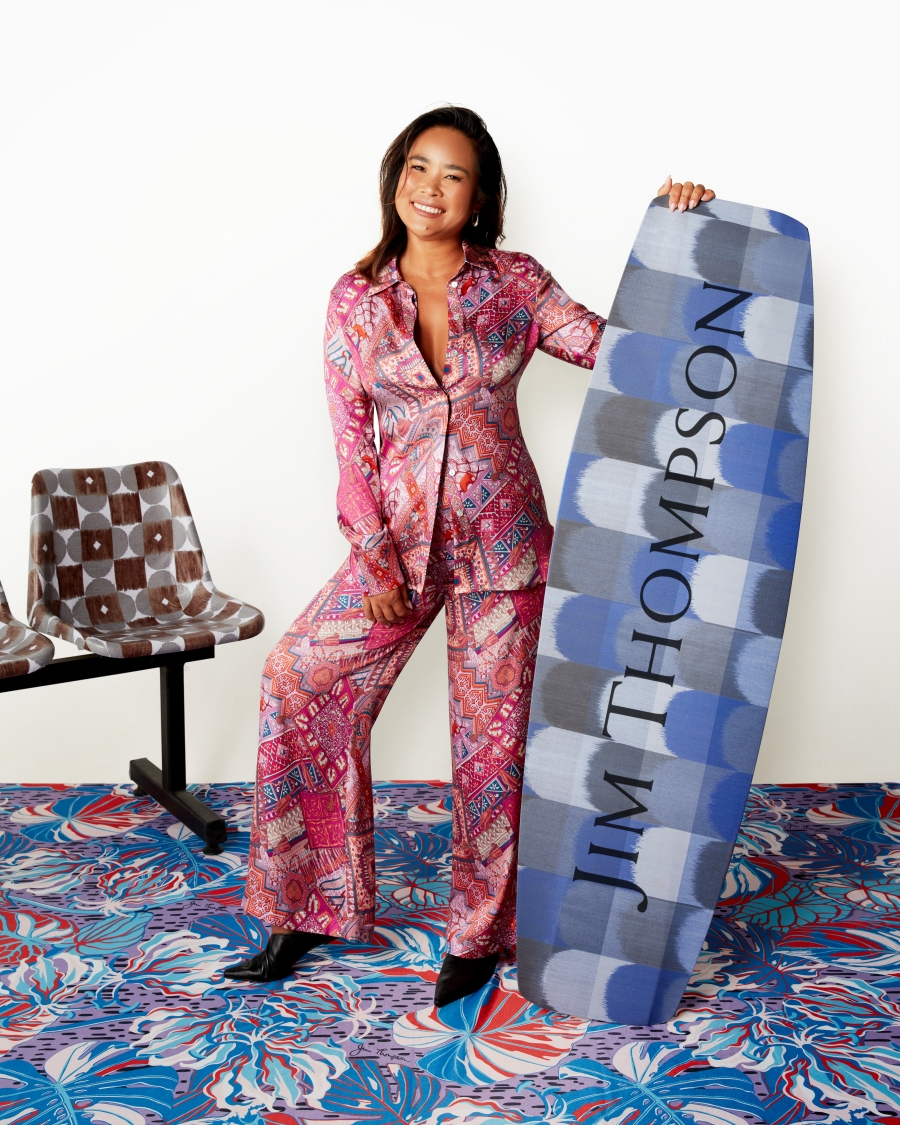From the badminton court to the sea, the campaign showcases talented kiteboarder Benyapa “Fawn“ Jantawan, a silver medalist from the latest Asian Games, stunning in a beach girl look while flaunting her wave–riding skills draped in flowing Thai silk. Reflecting on the campaign, she shares, “I’m thrilled to be part of this with fellow athletes. I’m a fan of Jim Thompson fashion—the comfort and unique prints are just perfect.” Calling for support from Thai fans, she adds, “Please send your wishes to the team!”