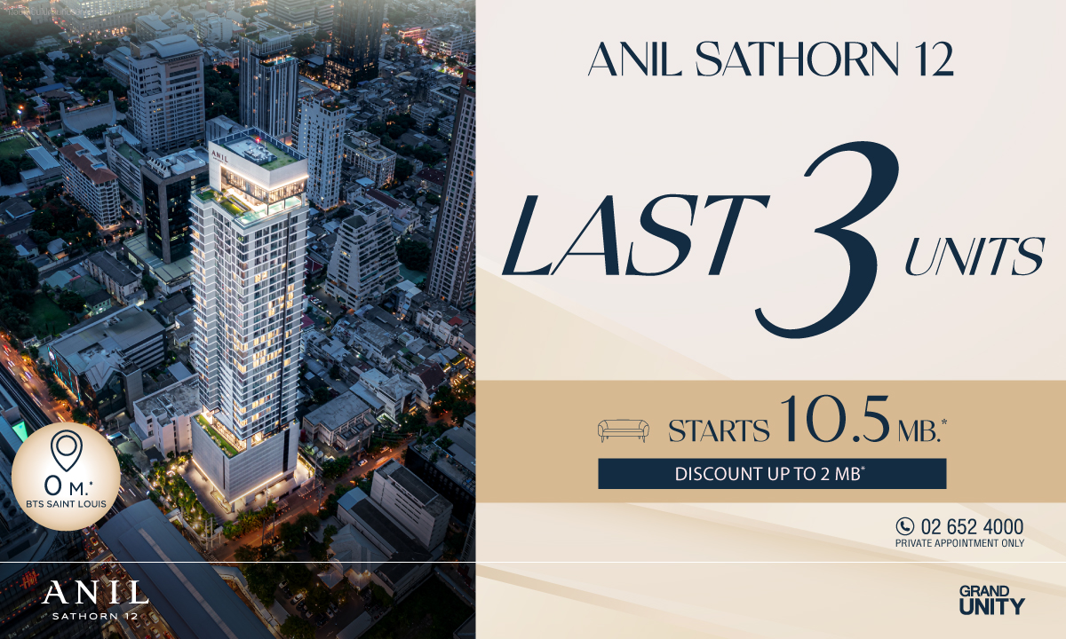 Grand Unity introduces a special promotion to kick off the quarter, targeting urban buyers seeking ready-to-move-in condominiums in a prime Real CBD location. The offer features the final three exclusive units at ANIL Sathorn 12, a super luxury condominium located in the heart of Sathorn, just steps from BTS Saint Louis (0 meters). The promotion includes exceptional benefits such as free Bosch electrical appliances, one year of free common area fees, and discounts of up to THB 2 million, with starting prices from THB 10.5 million.*