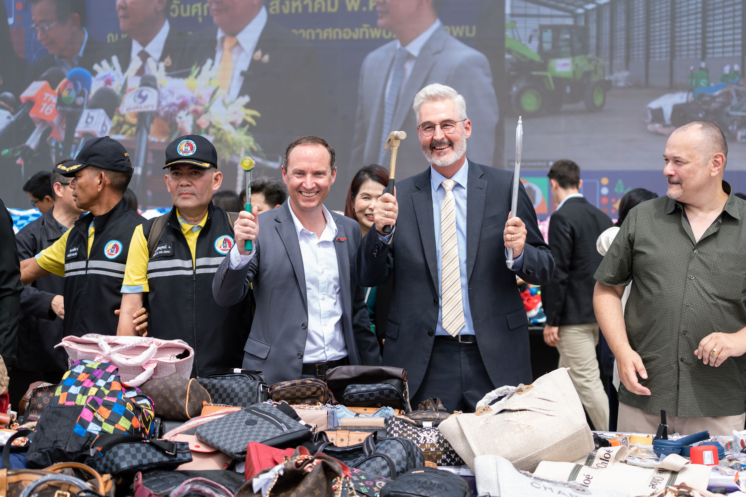 INSEE Ecocycle was entrusted by the Ministry of Commerce’s Department of Intellectual Property to manage the entire process, including the transportation and final destruction of seized counterfeit goods, as well as organizing the destruction ceremony for the intellectual property infringing items. This year’s operation took place at the facilities in Chonburi and Saraburi provinces, with the destruction process being witnessed at the Antiaircraft Artillery Battalion 7, Antiaircraft Artillery Regiment 1 in Don Mueang, Bangkok. The ceremony was presided over by Mr. Phumtham Wechayachai, Deputy Prime Minister and Minister of Commerce.