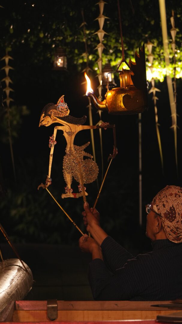 The Wayang performance is brought to life by a family who has lived and breathed Javanese tradition for generations. Bapak Bandel, a master puppeteer and long-time friend of Amanjiwo, has performed since the resort first opened its doors. His deep-rooted appreciation for Javanese culture has inspired his family to follow in his footsteps. In this performance, Bapak Bandel takes the role of the dalang (puppet master), accompanied by his wife, Ibu Wiwik, who lends her voice as the pasindhèn (Javanese singer), while their children and grandchildren form the gamelan orchestra.