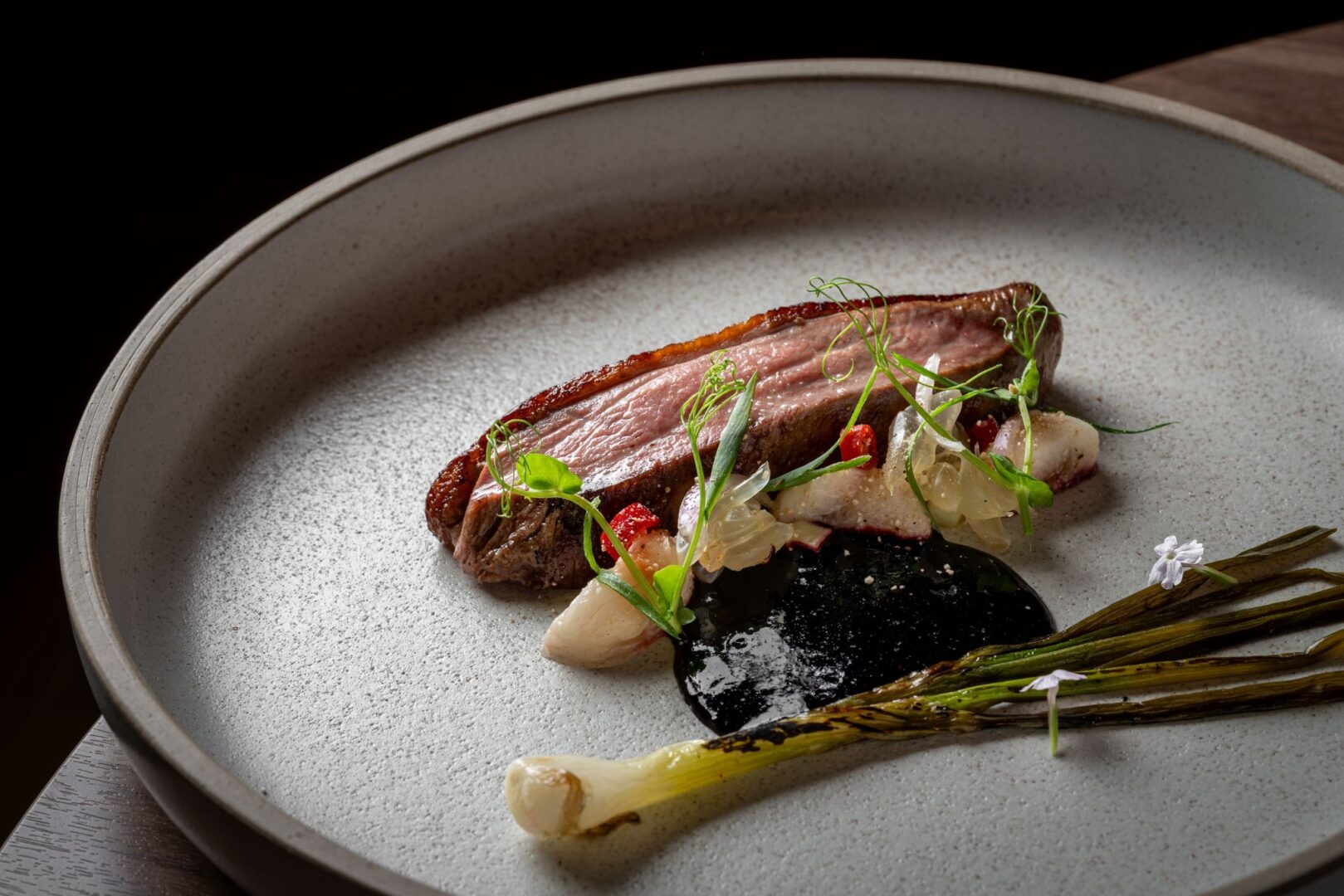 A signature standout from Chef Ian: Isan-style grilled duck breast with mulberry jaew and spicy Thai fruit salad.