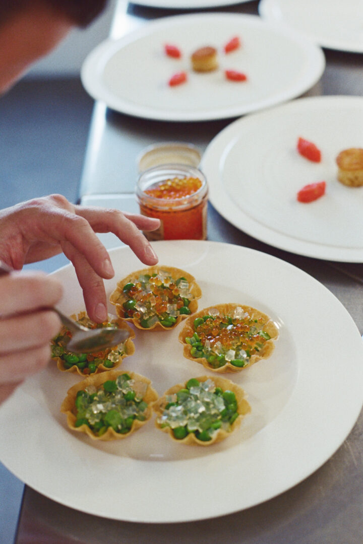 For boats departing from the South region of France, the focus shifts to Mediterranean-inspired flavours, reflecting Crenn’s deep connection to the sea from her early years, with dishes like soupe au pistou, made with market vegetables and herbs, and whole roasted sea bream served with carrot chorizo and bitter lettuce. A true lesson in French art de vivre, the menu will also include the French regional specialty, Raviole du Dauphiné, served family-style, and will finish with a light, refreshing lemon and olive oil tart.