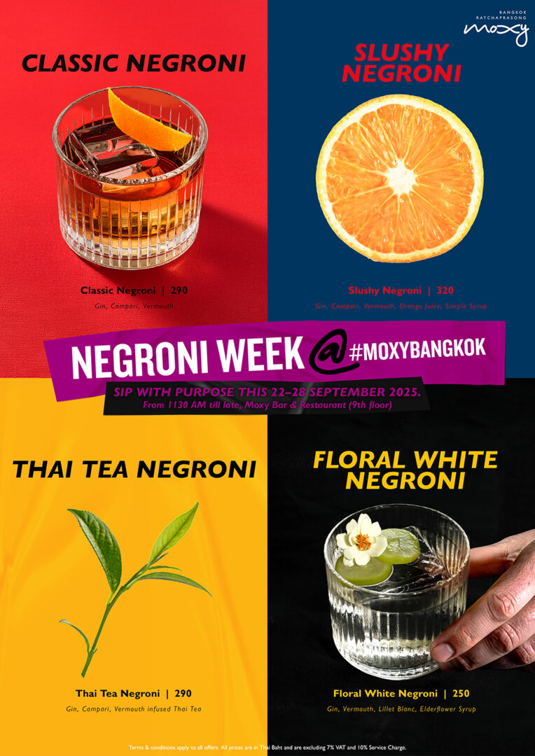 From 22 to 28 September 2025, Moxy Bar & Restaurant on the 9th floor will celebrate Negroni Week, joining the global initiative supporting Fondazione Slow Food ETS. From 11:30 AM until late, guests can enjoy bold Negronis starting at THB 250++ at the Moxy Truck. Menu highlights include the Floral White Negroni at THB 250++, the Classic Negroni at THB 290++, the Thai Tea Negroni at THB 290++, and the Slushy Negroni at THB 320++.