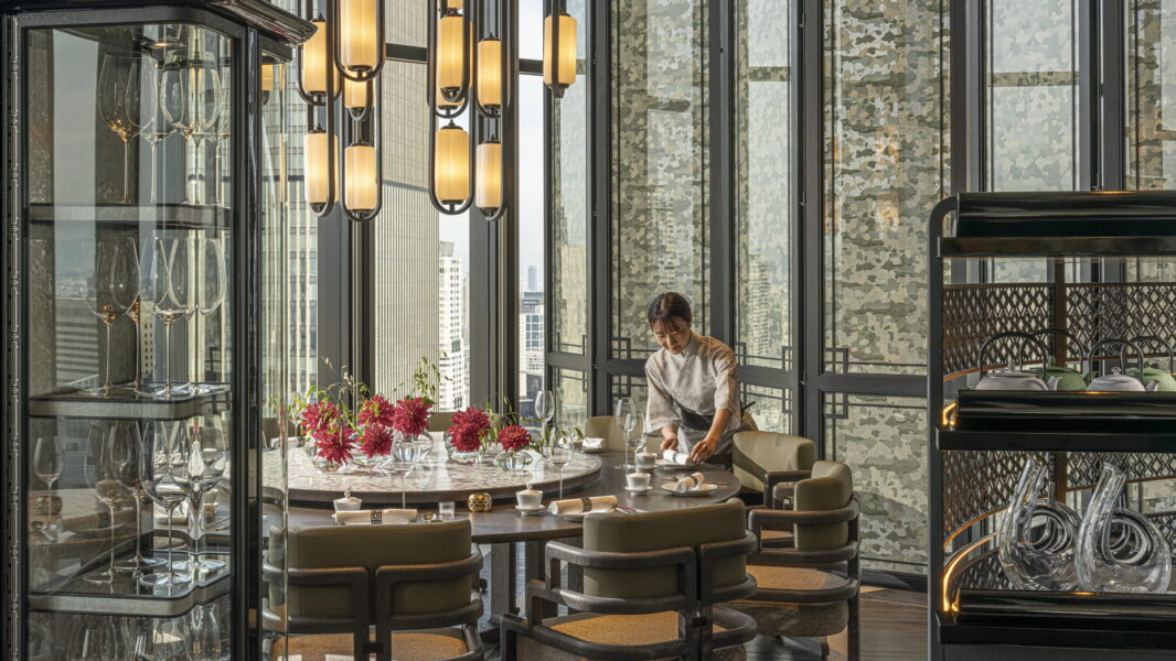 The Hotel’s signature restaurant is Jiang Nan Chun, where authentic Cantonese cuisine is presented in a striking setting that emphasizes an interactive dining experience. Here, under soaring ceilings and against glittering skyline views, guests are treated to barbecue specialties, as well as a show-stopping roast duck carved tableside. The restaurant also offers two semi-private dining rooms, plus one fully private room with its own show kitchen.
