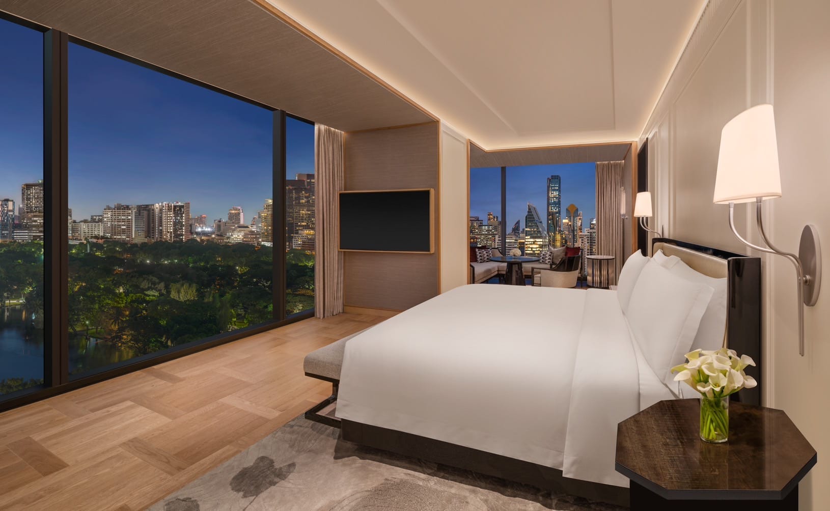 The rooms and suites reflect a blend of traditional Thai art and contemporary design, with floor-to-ceiling windows offering stunning views. Many rooms also feature private balconies overlooking the lush greenery of Lumpini Park. Guests can choose from the spacious Deluxe Room (50 square meters), the elegant Gardenia Suite (102 square meters), or the charming Marigold and Amaranth Suites (127 square meters). There is also the exclusive Ritz-Carlton Suite penthouse, offering 389 square meters of luxury and unique relaxation. Prices start at 18,xxx++ per night.