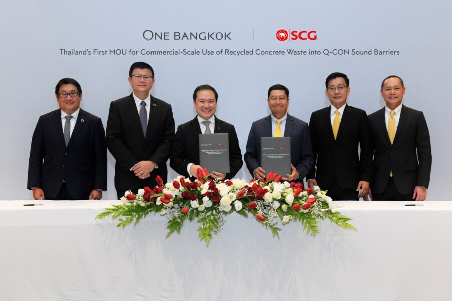One Bangkok,Thailand’s largest integrated development in the central business district of Bangkok, together with SCG and Quality Construction Products Public Company Limited (Q-CON) signed a Memorandum of Understanding (MOU) to collaborate on the recycling of Autoclaved Lightweight Concrete (ALC) waste into Q-CON sound barriers for underpass entrance to One Bangkok. The partnership reiterated One Bangkok’s ambition to achieve ‘zero waste to landfill’ goals to maximise resource efficiency, reduce environmental impact, and raise the bar on construction industry standards in Thailand towards a sustainable future.