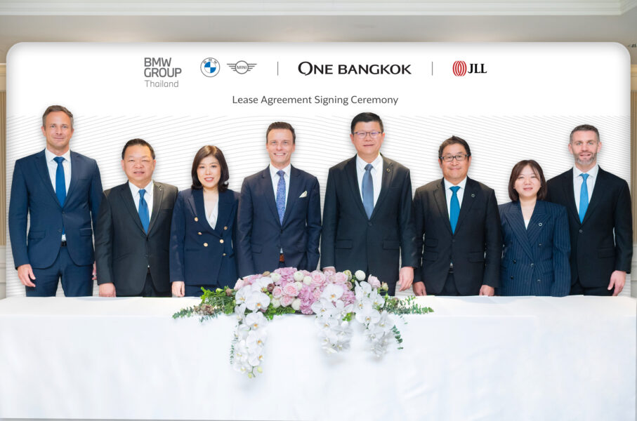 Lim Hua Tiong (4th from right), Chief Executive Officer of One Bangkok, recently signed a lease agreement with BMW Group Thailand, represented by Rene Gerhard (4th from left), President and CEO of BMW Group Thailand. The agreement secures office space at One Bangkok Tower 3 for BMW Group Thailand’s new headquarters. The signing ceremony was attended by Jariya Koonlinthip (3rd from left), Chief Executive Officer of BMW Financial Services Thailand; Worawat Srisa-an (3rd from right), Deputy Chief Executive Officer of One Bangkok; Matthys De Kock (far left), Head of Real Estate Management – BMW Asia Pacific, Middle East, Africa; Tattayakorn Benjapattharaseth (2nd from right), Senior Vice President and Head of Office at One Bangkok; Preecha Ninatkiattikul (2nd from left), Director, Change Management and Special Projects, BMW Group Thailand and Michael Glancy (far right), Country Head of JLL Thailand.
