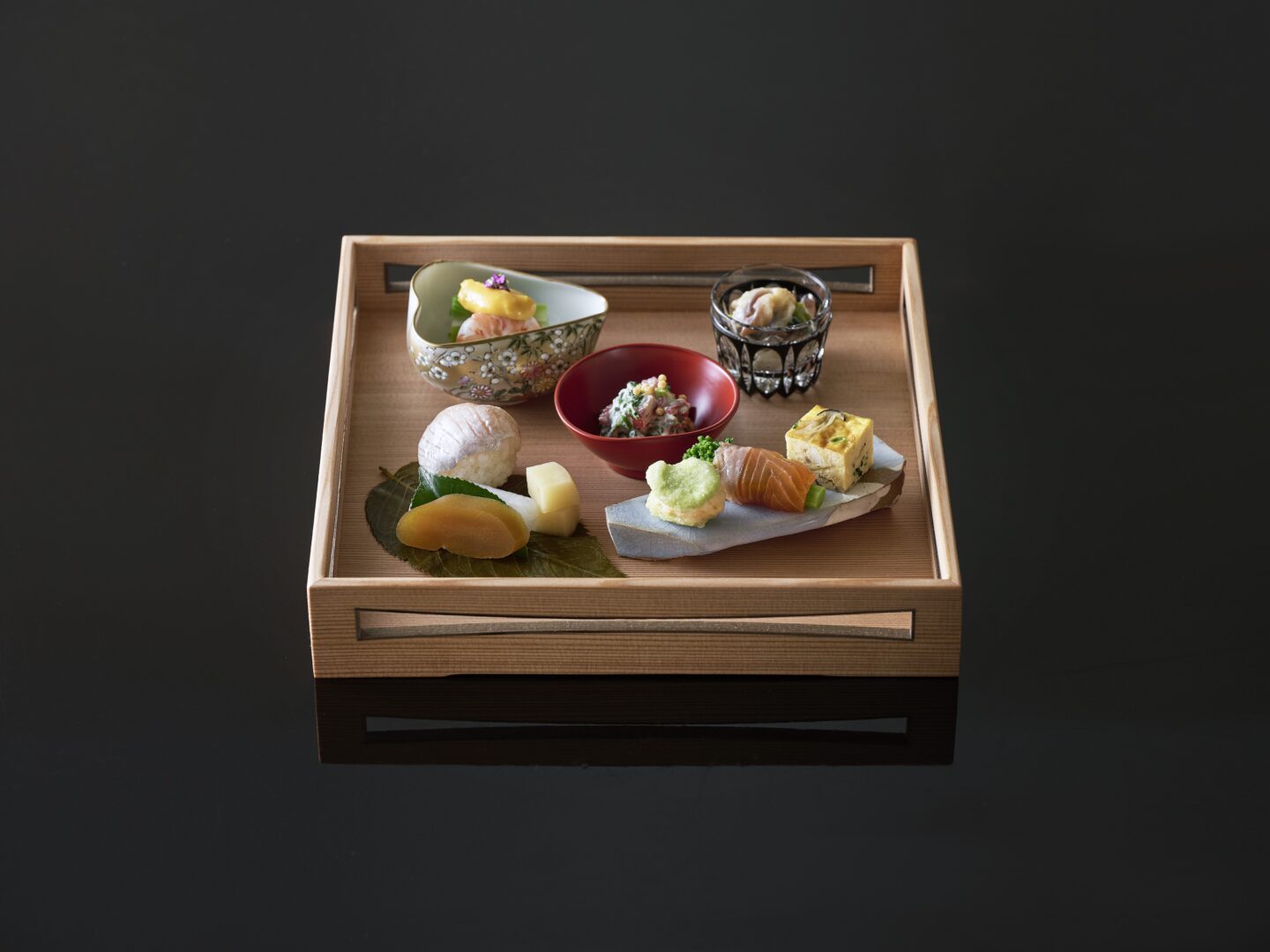 At Wadakura, the already artful kaiseki presentation is elevated with the incorporation of lacquerware by Nishimura Keikou Urushi, pottery by Asahiyaki, woodwork by Nakagawa Mokkougei and porcelainware by Kinzangama. As palate cleansers, wine from Grace Wine in Yamanashi prefecture and tea by renowned tea company Ippodo will be served.