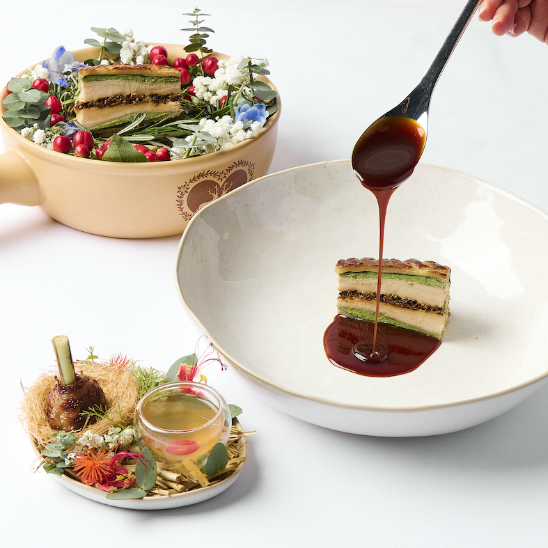 This dish starts with a French-style pie using puff pastry dough that is beautifully baked until crispy, giving a crispy outside and soft inside texture. Chef Big creates a pie filling that is full of intention and meticulousness by choosing chicken breast stuffed with Morel mushrooms, which are outstanding with their deep flavors, adding layers of coriander and thin spinach that enhance the smoothness of every bite. The rich Jus sauce served together is created from different parts of the remaining chicken. The chef adds depth of flavor with aromas from young galangal and black cardamom to give the sauce a dimensional flavor and goes well with the exquisite pie on the side, which is chicken legs marinated in lemongrass, grilled on Binchotan charcoal until fragrant, served with chicken consommé soup that has a slightly sour taste from goji berries. Help cut the richness and add freshness to make this dish perfect.