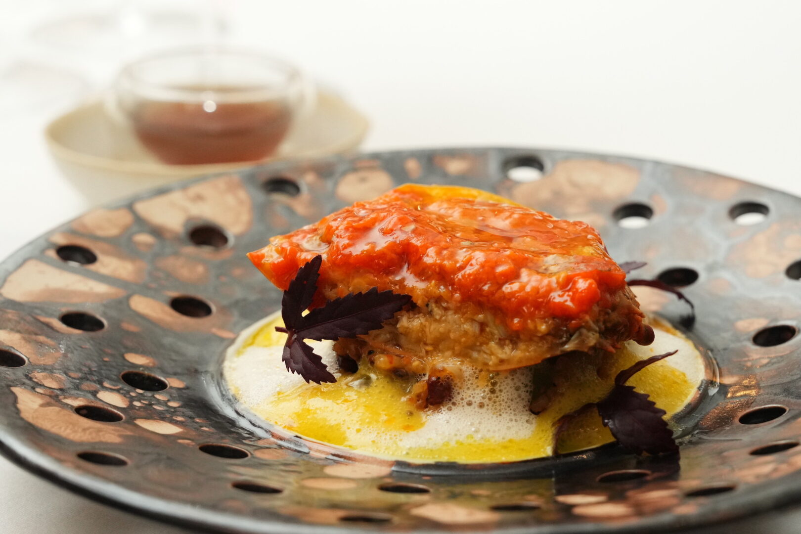 Baked Crab Rice | Yellow Chilli Foam | Smoked Chinese Olive Beurre Blanc | Lettuce | Crab Consommé