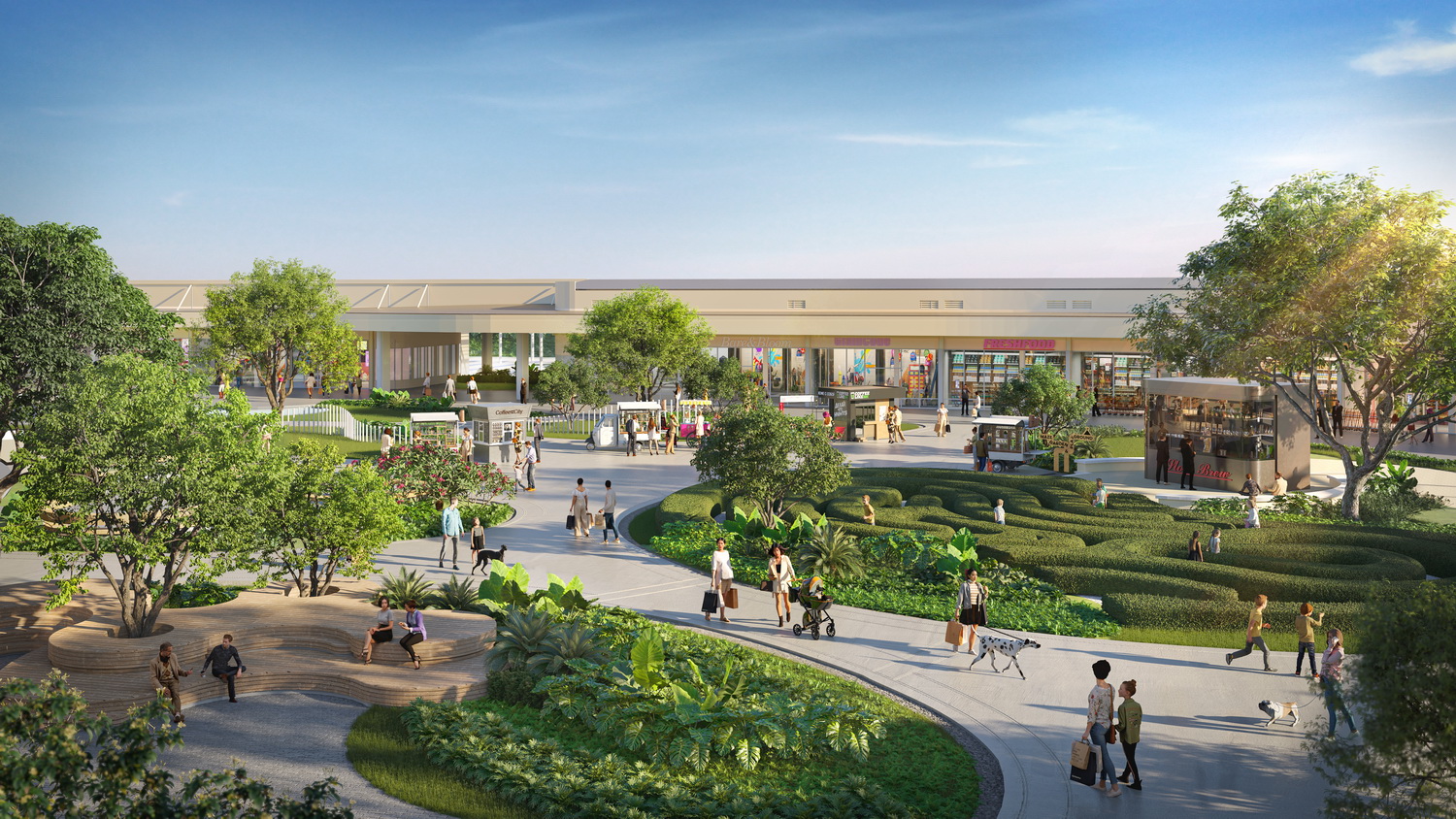 Green Space: A large central lawn surrounded by mature trees and landscaped gardens, ideal for outdoor activities, family recreation, and community gatherings. This area links seamlessly to surrounding retail shops and the Pet Park, serving as a welcoming public space for visitors of all ages.