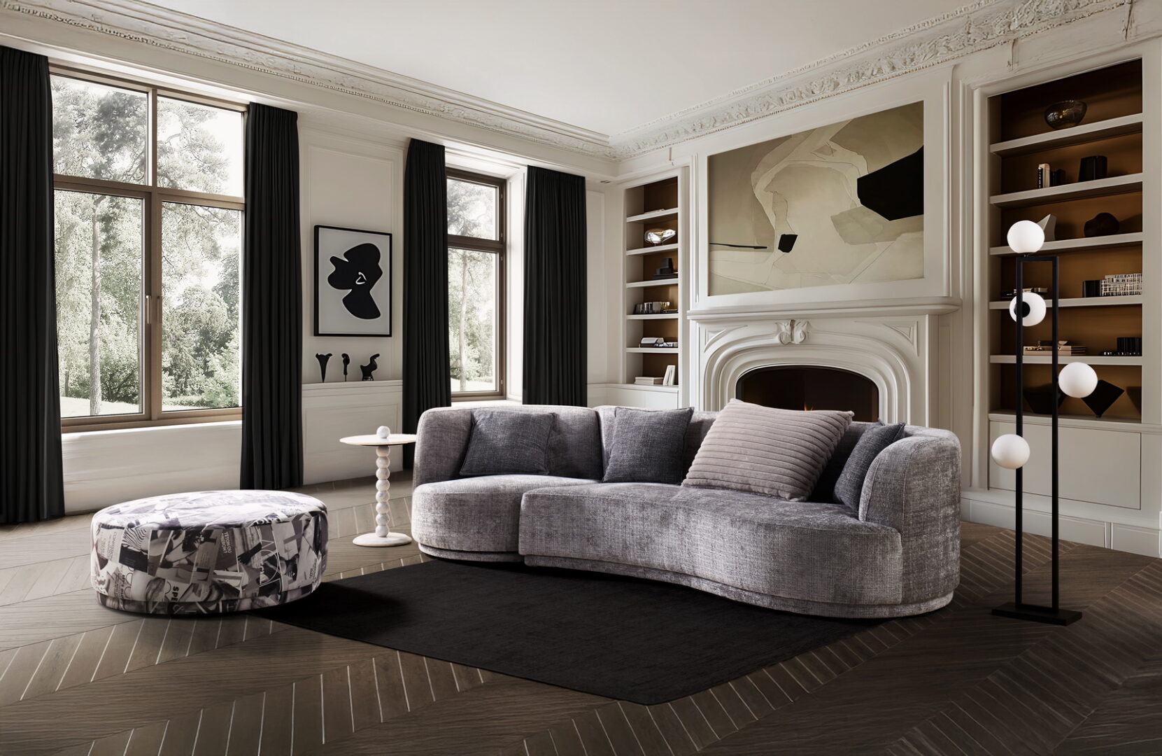 The Lazane Sofa – Limited Edition: A gracefully curved silhouette in a signature grey tone, paired with a custom-designed round ottoman featuring the “ELLE 80th Anniversary” motif, offering both elegance and functionality for any living space.