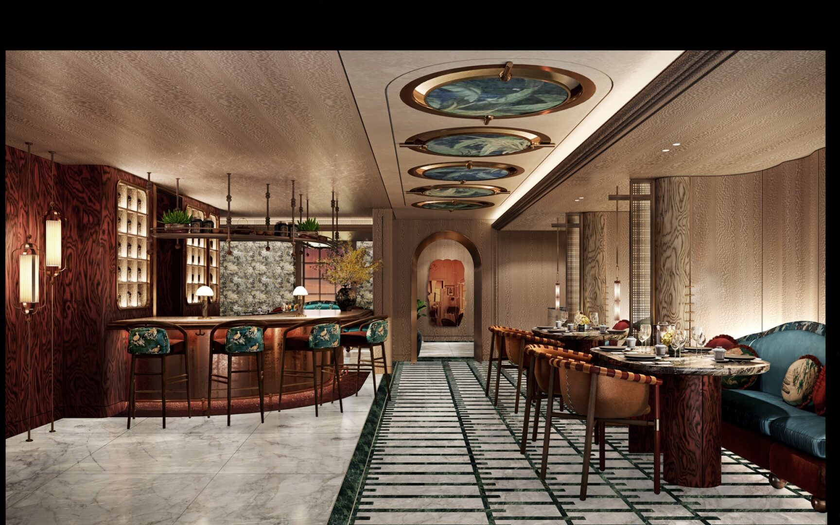 The interplay of texture and patterns, and the collaboration with local Thai artists and brands are also another highlights of the project, from the Key Hanging Phoenix Crown pendant lights by Thai artist “Pin Metal Art” at the atrium and staircase, to the wall papers by famous Thai brand Jim Thompson, Bellitas’ lighting Task’s furniture, Cotto Italia and L Thai tiles, as well as Siam Woodland timber, all chosen to champion Thai artisanship while upholding the restaurant’s refined aesthetic vision. Luxurious accents include spider green flooring, carvalho wood textures, and graduated metalwork that establish richness and visual fascination throughout the restaurant. The collaboration among SLH team and Thai brands synergize the creative expression and bring out this beautiful immersive dining place where texture, craft and quiet storytelling come together. The restaurant’s material vocabulary reflects SLD’s dedication to both opulence and cultural integrity.