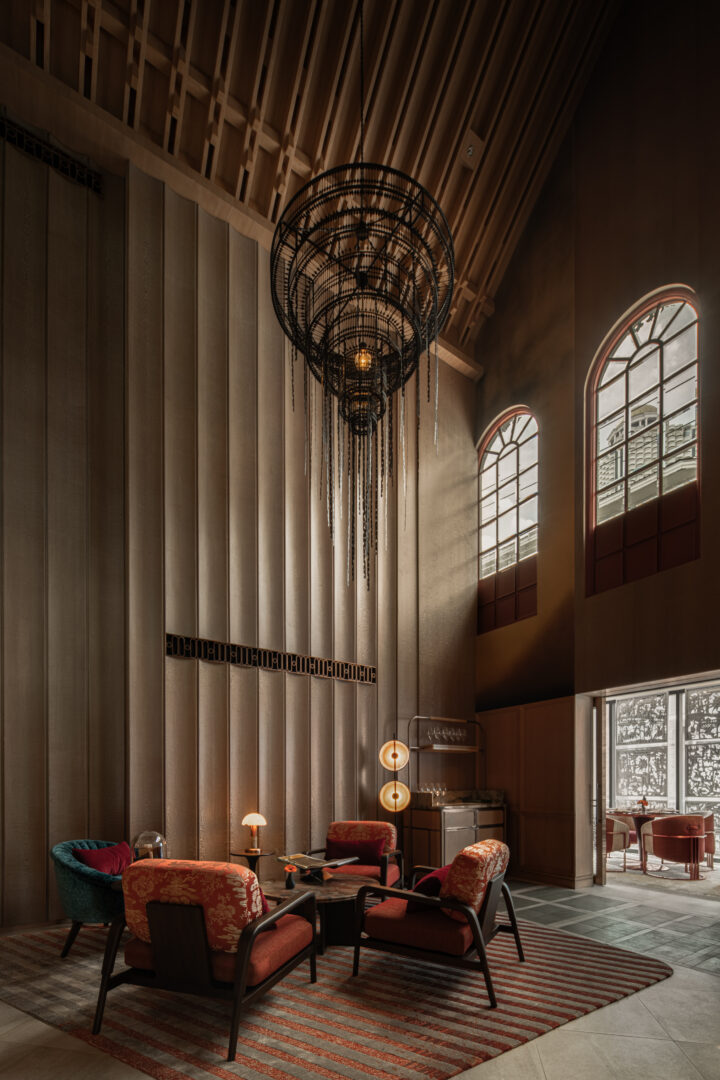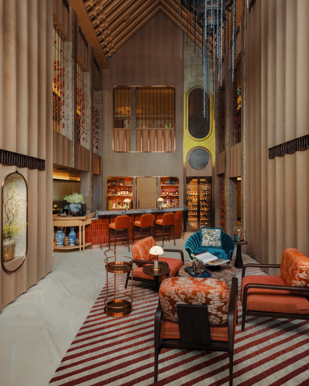The ground floor welcomes guests into a bar and lounge area. Here, the two-story-high atrium is themed in wood and deep burgundy red with teal accents, creating a sense of openness and a cozy ambience and complemented by red abacus-inspired curtains that hang from the second floor. Together, they guide guests into a contemporary Chinese atmosphere of relaxed joy. The Phoenix Crown pendant lights, suspended in the central atrium and above the stairway, embody the passing of joy through generations. This makes the space not only visually attractive but also emotionally resonant.
