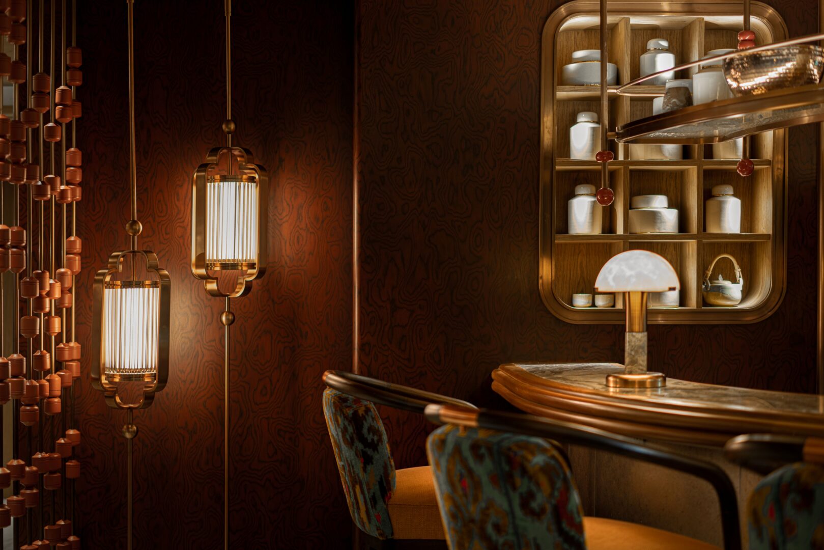 The secluded tea bar, nestled beneath a stylish ceiling design to foster a sense of refinement, honours the Chinese tradition of tea pairing with food in Chaoshan culinary culture. The ceiling, finished in deep burgundy and teal highlights, is complemented by locally sourced luxury stone and artisan-made furnishings, fostering an atmosphere ideal for reflective interludes and cherished conversations. The adjoining bar and social lounge extend this contemplative experience, presenting a sophisticated environment where seasonally updated tea and food pairings harmonize with contemporary hospitality.