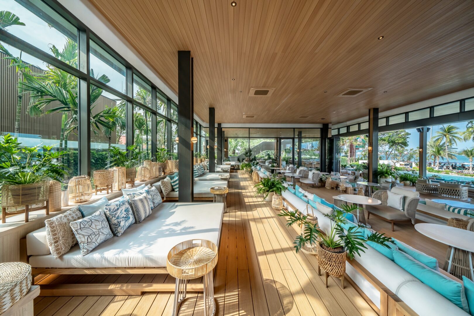 Also exuding a Mediterranean feel, the lounge and bar area anchoring the beach club caters to almost 250 people. The space is crowned by a chic rooftop lounge, with a capacity for more than 100 guests seated or 300 guests for cocktail events, affording panoramic views of Pattaya Beach.