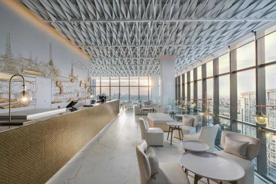 With drink trolleys in circulation, The Open Living Lounge’s offerings include, but are not limited to, grab-and-go barista coffee, morning pastries, cold-pressed juices, kombucha, and a Spanish afternoon tea. The lounge’s design takes cues from another Bangkok landmark, Wat Phra Kaew, with, for example, a golden counter inspired by Wat Phra Kaew’s traditional Thai decorations gilded in gold leaf.
