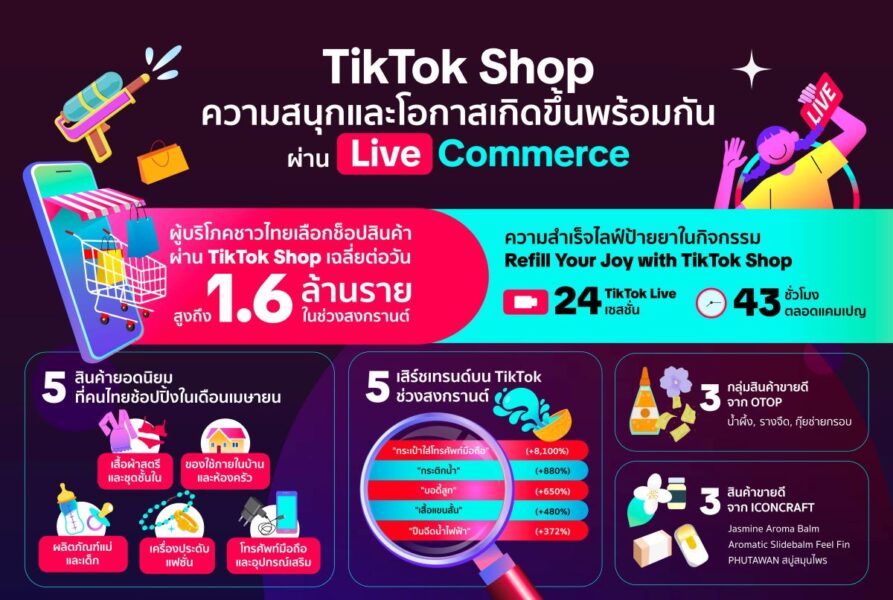 TikTok Shop, the leading e-commerce solution in Southeast Asia, reveals that Live Commerce adds fun and new business opportunities to the e-commerce ecosystem in every moment of life, whether it’s Songkran or Back-To-School. It reveals that the product category “Womenswear & Underwear” surged to the top of the list of most popular products in April, followed by the category “Home & Kitchen.” Thai consumers choose to shop via TikTok Shop, with an average daily traffic of 1.6 million during Songkran. Consequently, the activity “Refill Your Joy With TikTok Shop – เติมความสนุก สุขเต็มตะกร้า,” organized by TikTok Shop together with partners, can unleash the power of fun and help support more local shops selling products simultaneously on the platform.
