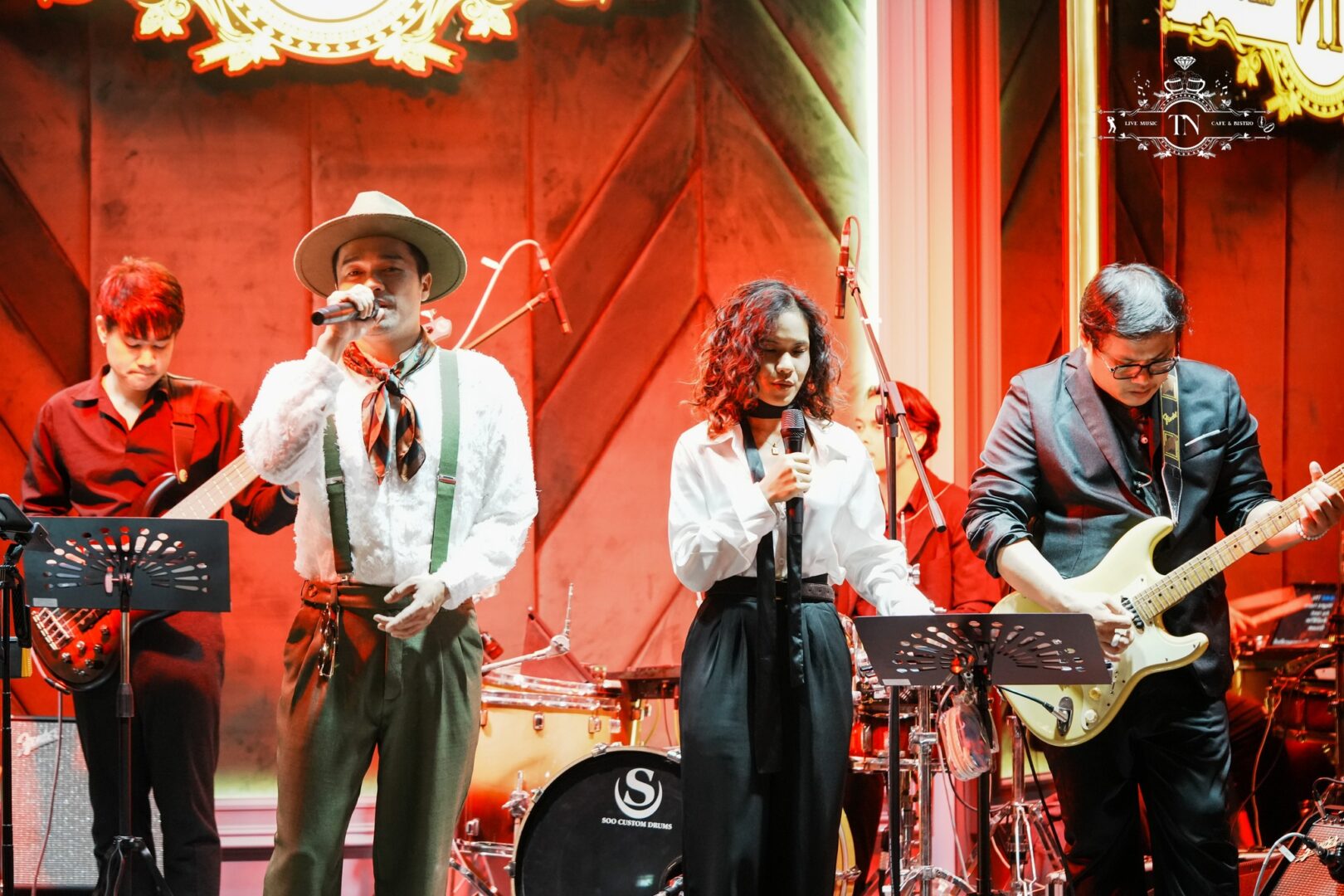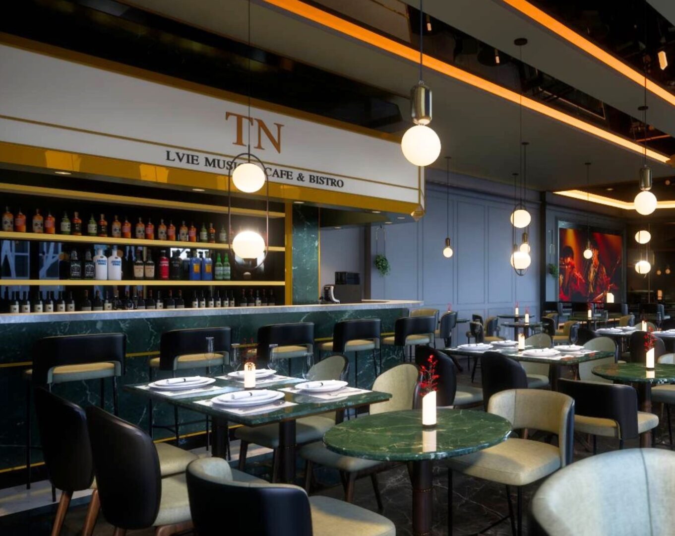 The two-story venue accommodates approximately 120 guests and features a live music stage and a stylish beverage bar adorned with emerald-patterned stone and brass accents, creating an elevated ambiance inspired by modern European bistro aesthetics. During the daytime, the café serves food, drinks, coffee, and brunch from 08:00–17:00, while the evening transforms the space into a relaxed social venue offering live jazz, soul, and R&B performances, with service continuing until 02:00 am.