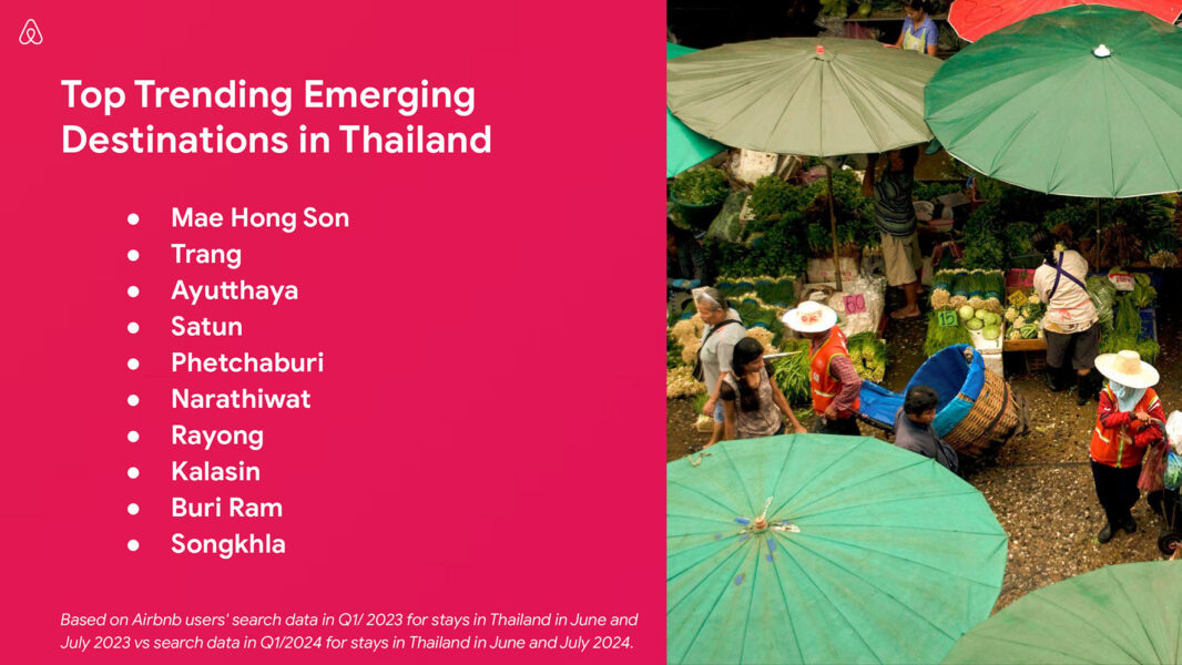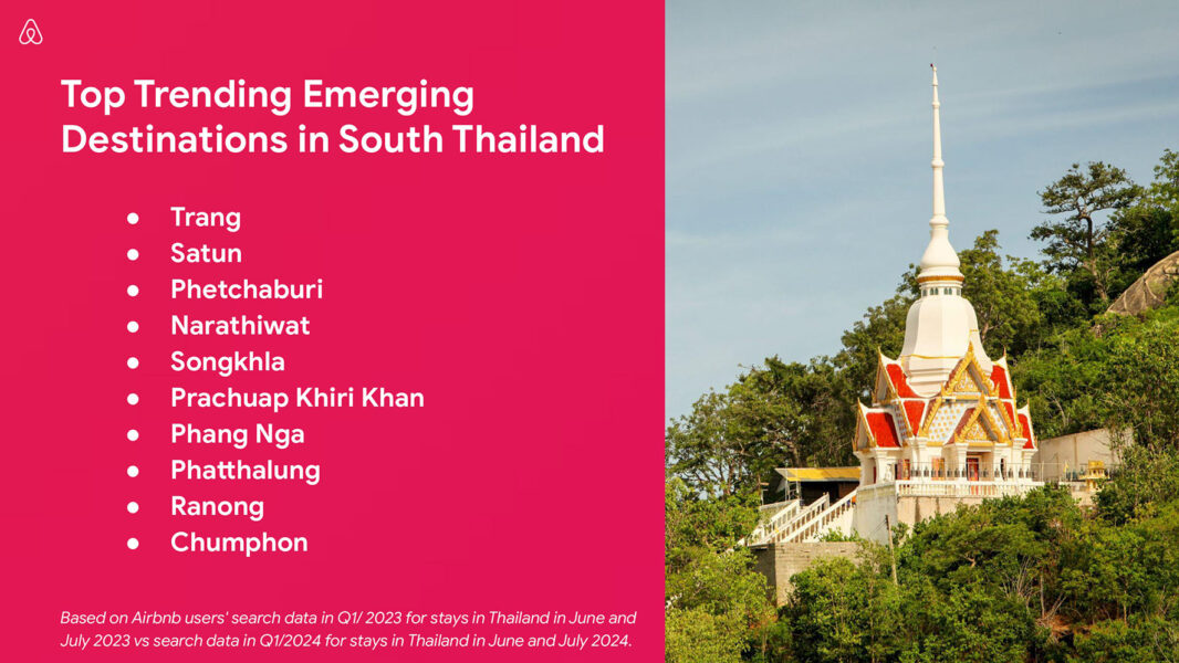 The rise of Thailand’s Deep South  Rich in culture, Thailand’s little explored Deep South and adjacent provinces are often overlooked by travelers, yet. Amongst Airbnb guests the region is seeing a surge in interest. Sharing a border with Malaysia and known for its nature and coastline, Narathiwat is the top trending emerging destination in the Deep South with an 87 percent increase in searches by Airbnb guests from Q1 2023 to Q1 2024.