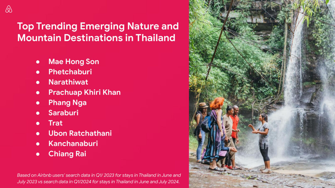 Nature and mountain destinations strike a chord with Airbnb guests  Thailand’s nature and mountainous landscapes are drawing interest amongst domestic and international travelers as they look for new travel experiences away from the major tourist centers. Mae Hong Son’s abundance of forests, mountain terrain and stunning river scenery is appealing to travelers as searches are up almost 150 percent from Q1 2023 to Q1 2024, while Phetchaburi – home of Kaeng Krachan National Park with a wide variety of flora and fauna, including wild elephants – ranked second trending emerging nature and mountain destination in Thailand by Airbnb guests from Q1 2023 to Q1 2024.