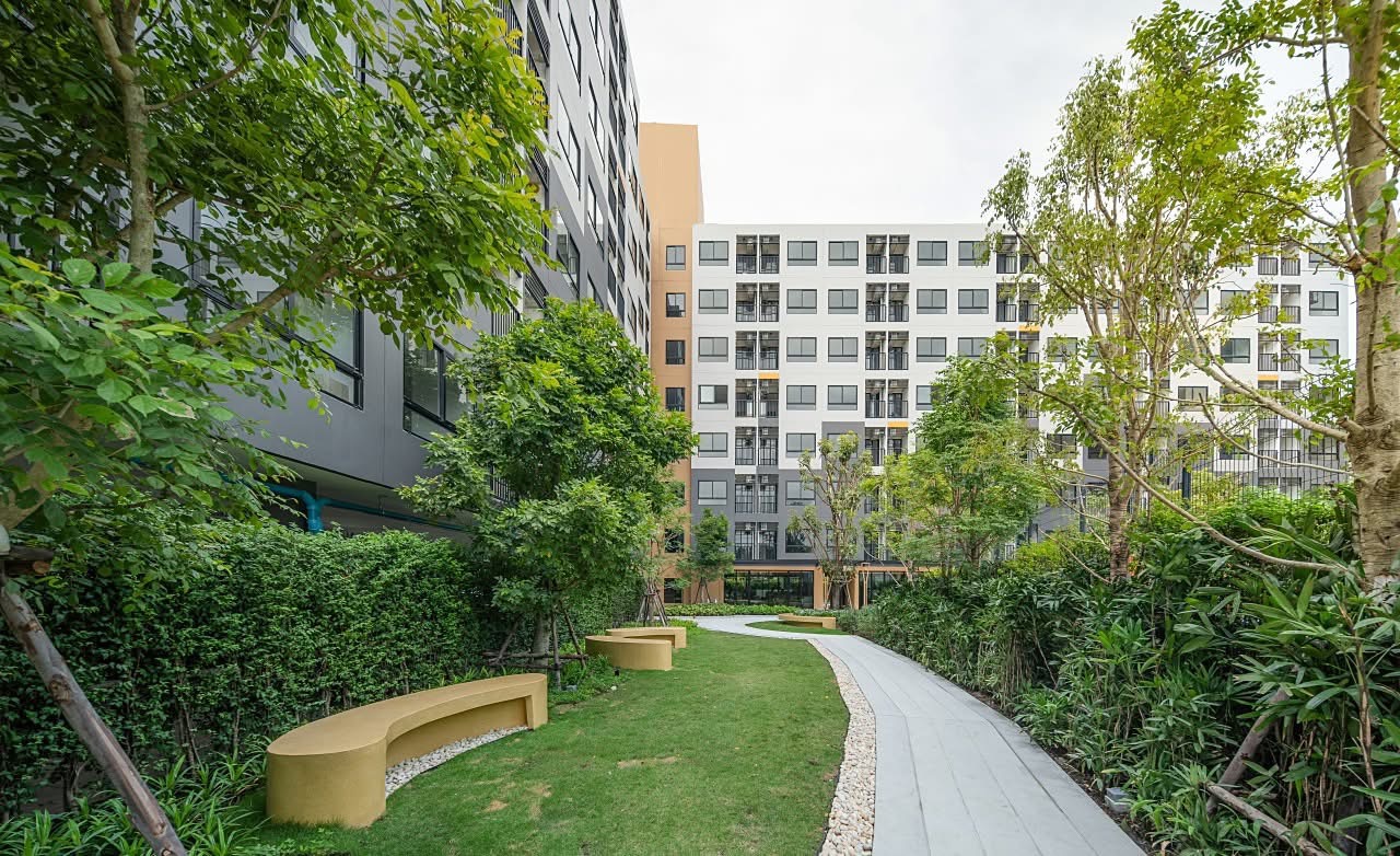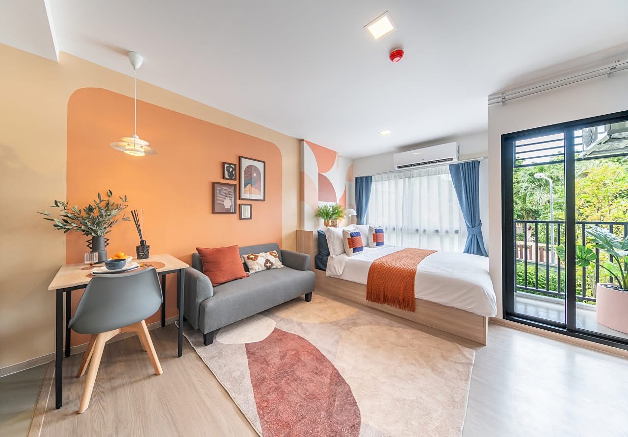 The project is fully furnished, with everything you need including a dining table, chairs, TV stand, sofa, side tables, shoe rack, wardrobe, and bed, in addition to air conditioning. The project also includes 4 additional appliances: a TV, refrigerator, microwave, and water heater. The common areas are designed for residents to recharge, with amenities such as a Co-Working Space, Gym, and a larger Garden area. Prices start at just 1.39 million THB*.
